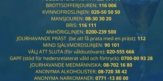 Om du är i behov av hjälp eller stöd i helgen så finns det olika nummer som är viktiga. Dela gärna vidare bilden så att fler får ta del av listan. Listan är skriven av Polismyndigheten.